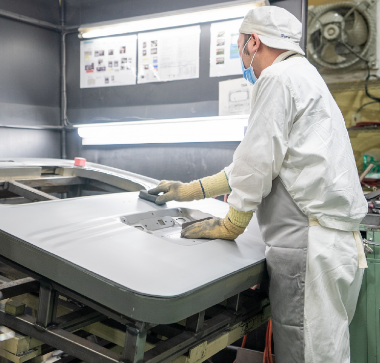 - 主に車のテールゲート(バックドア)を、ロボットによる溶接とヘミング曲げによる加工で作っています。また他工場と違い、お客様に近い場所で工場を構えて、少数精鋭で効率よく生産を行っている部署です。
