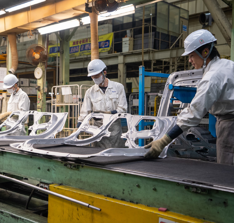 - 主にプレスをメインとした生産現場であり、軽自動車のテールゲート(バックドア)など外板部品と言われる人の目に触れる部品のプレス成形を行っています。また、人気ミニバンなどの部品の加工を行っており、活気に溢れた部署です。