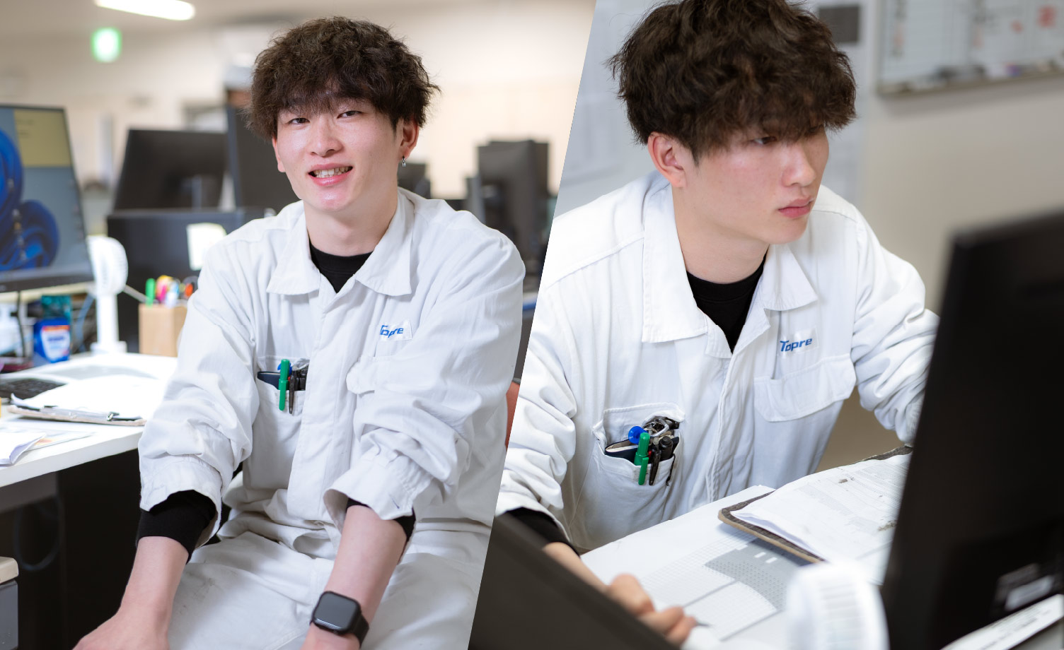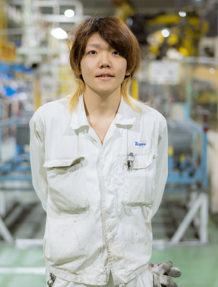 技術部で新規設備や治具の導入を進め、課長としてマネジメントを行っています。ゼロから設備を作り上げる過程や、新技術を成功させた時の達成感がやりがいです。入社後はロボットや電気回路のプログラミング、図面設計など多くを学びました。今後は依頼された業務を100%以上のパフォーマンスでやり遂げ、課員全員で安全で不具合のない設備を構築することを目標にしています。