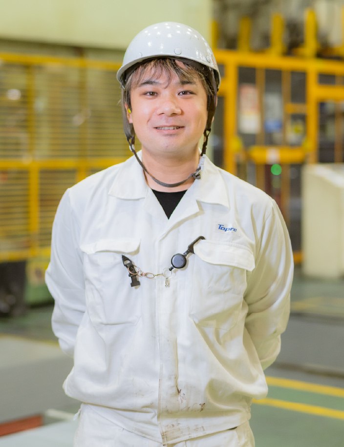 4300tプレスタンデムラインのオペレーターとして勤務し、ラインリーダーとして生産指示などを担当しています。大型プレス機やロボットを操作できることが楽しく、難しい操作を覚えた時に達成感を感じます。入社後は車の外板や内板の加工工程を学び、コミュニケーションやチームワークの大切さも身につけました。出来高目標を達成するため、効率改善に日々取り組んでいます。
